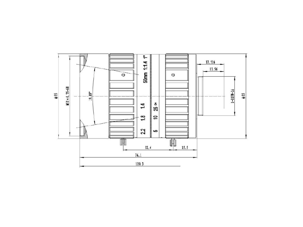 Megapixelový objektív pre kamery s rozlíšením do 8 Mpx, manuálna clona, typ závitu C, f=50 mm, F1.4, pracovná teplota od -30 °C do +70 °C, rozmery ø 58 × 76,1 mm, hmotnosť 430 g