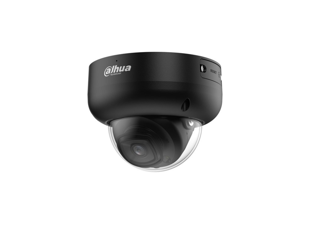 8 Mpx Dome IP kamera, exteriérová, Day/Night, IR 50 m, WL 50 m, 1/1.8" 8 Megapixel CMOS, rozlíšenie 3840 x 2160 px @ 1-25/30 fps, citlivosť 0,0008 lx @F1.6, objektív 2,8 mm, uhol záberu H: 110°, V: 56°, D: 134°; AWB, AI-ISP, BLC, HLC, WDR 120dB, AGC, ROI, 3DNR, SSA, Defog, LDC, Full Color; kompresia H.265 / H.264 / H.264H / H.264B / MJPEG (Sub Stream), RTMP, podpora Smart a AI Codekov, ONVIF kompatibilné; inteligentné funkcie: EPTZ, IVS (Perimeter Protection), Large AI model (Xinghan), SMD 4.0, AcuPick, Face Detection, People Counting, Queue Management, Heat Map, Video Metadata, Smart Search; RJ-45, zabudovaný mikrofón, micro SD karta max. 1 TB, Alarm I/O 1/1, Audio I/O 1/1, napájanie 12 V DC / PoE+ (802.3at) / ePoE, Dual Power Backup, spotreba max. 15,6 W, pracovná teplota od -40 °C do +60 °C, IP67, IK10, rozmery 94 x ø122 mm, hmotnosť 0,713 kg, čierna verzia.