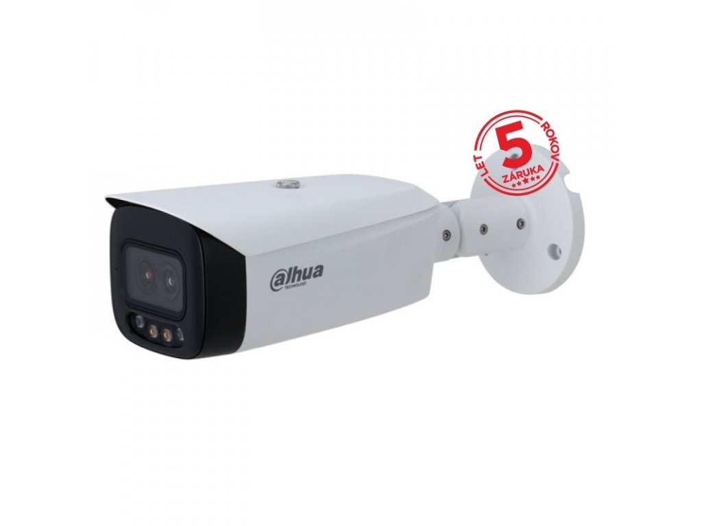 4 Mpx kompaktná duálna Full-color AI IP kamera, exteriérová, Day/Night, 1/1.8" + 1/2.8" CMOS, IR LED s dosvitom 50 m (Viditeľný prísvit je možné vypnúť a použiť len IR prísvit), rozlíšenie 2688 × 1520 px, snímkovanie: 2688 × 1520px @ 1–25/30 fps, citlivosť 0,0002 lx @ F1.0, pevný objektív 3,6 mm, uhol záberu H: 75°, V: 39°, D: 87°, horizontálne otáčanie: 0°–360°, vertikálny náklon: 0°–90°, rotácia: 0°–360°, AWB, AGC, ROI, BLC, HLC, WDR, SSA, 3D NR, kompresia H.265 / H.264 / H.264B / MJPEG (sub stream), ONVIF kompatibilné, podpora RTSP, integrovaný mikrofón, alarm I/O 1/1, audio I/O 1/1, RJ-45 (10/100), slot na MicroSD kartu max. 256 GB, pracovná teplota od -40 °C do +60 °C, IP 67, IK10, napájanie DC 12 V, PoE (802.3af), spotreba max. 11,8 W, rozmery 288,4 x 94,4 x 84,7 mm, hmotnosť 1 kg