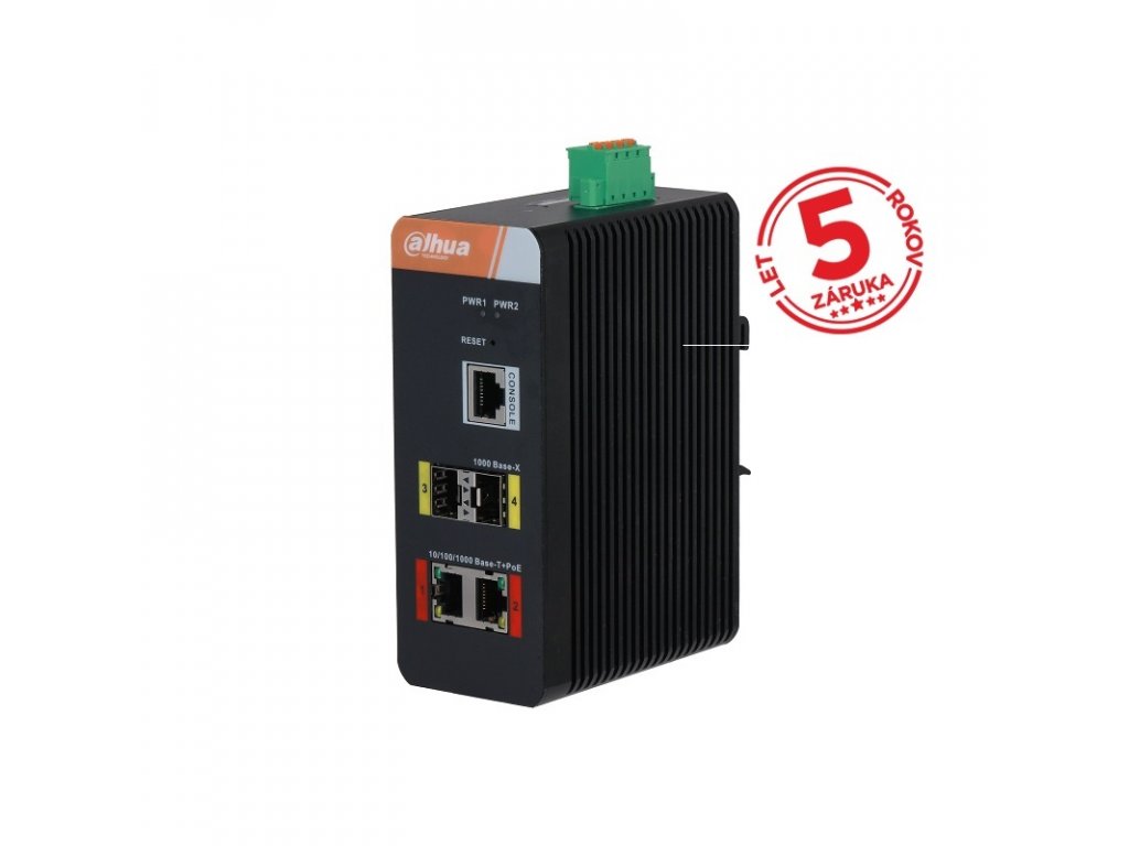 Dahua priemyselný switch, management, 2x Gbit PoE + 2x Gbit SFP + 1x Gbit uplink, napájanie 48–53 V DC (zdroj nie je súčasťou balenia), 2x Hi-PoE porty max. 90 W, celkem max. 120 W, pracovná teplota od -40 °C do +75 °C, montáž DIN-Rail, hmotnosť 0,65 kg, rozmery 94,4 x 53,5 x 135,0 mm. Switch nie je vhodný pre Avigilon kamery.