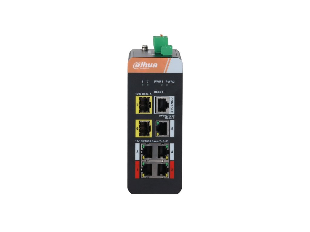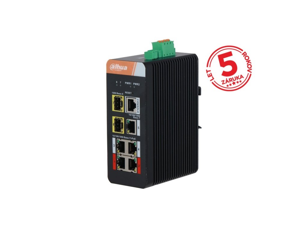 Dahua priemyselný switch, management, 4x Gbit PoE + 2x Gbit SFP + 1x Gbit uplink, napájanie 48–53 VDC (zdroj nie je súčasťou balenia), 2x Hi-PoE porty max. 90 W, 2x PoE+ porty max. 30 W, celkem max. 120 W, pracovná teplota od -40 °C do +75 °C, montáž DIN-Rail, hmotnosť 0,65 kg, rozmery 94,4 x 53,5 x 135,0 mm. Long Distance PoE do 250 m, Manažovatelný L2 switch. Switch nie je vhodný pre Avigilon kamery.