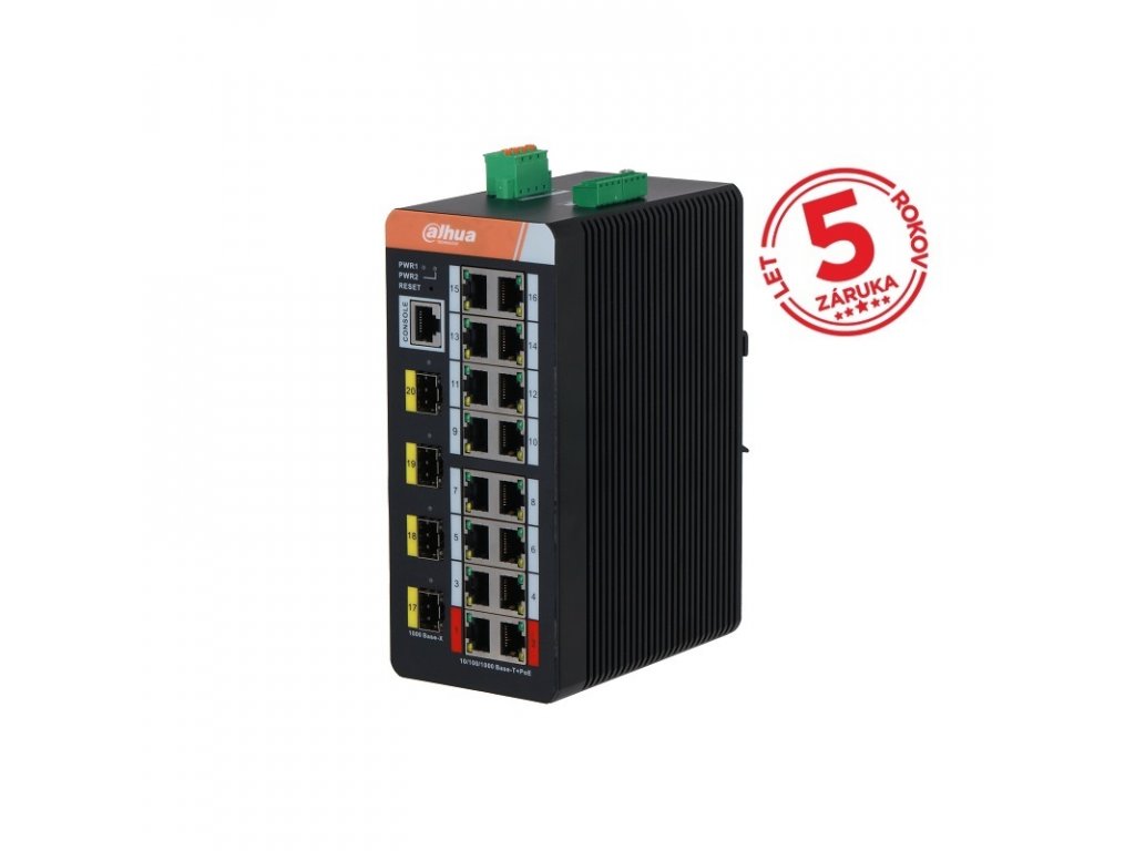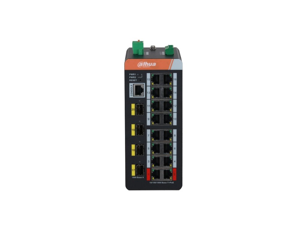 Dahua priemyselný switch, management, 16x Gbit PoE + 4x Gbit SFP, napájanie 48–53 V DC (zdroj nie je súčasťou balenia), 2x Hi-PoE porty max. 90 W, 14x PoE+ porty max. 30 W, celkem max. 240 W, pracovná teplota od -40 °C do +75 °C, montáž DIN-Rail, hmotnosť 1,35 kg, rozmery 125,4 × 75,0 × 175,0 mm. Switch nie je vhodný pre Avigilon kamery.