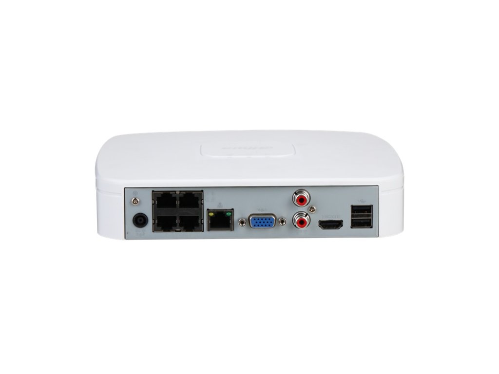 IP rekordér 4 kanálov, Smart H.265+ / H.265, Smart H.264+ / H.264 / MJPEG; 80 Mbps incoming, 80 Mbps recording, 60 Mbps outgoing; rozlíšenie kamery max. 12 Mpx; AI funkcie na NVR: SMD Plus 4 kanály; AI funkcie z kamier: Perimeter protection 4 kanálov, SMD Plus 4 kanály; 4x RJ-45 10/100 PoE+ (802.3af/at), spolu max. 36 W, jeden port max.: 25,5 W; 1x SATA max. 20 TB na 1 disk; Audio RCA I/O 1/1; 2x USB 2.0, 1x HDMI, 1x VGA, 1x 10/100 RJ-45 port; napájanie 53 V DC 1,22 A spotreba max. 46 W (bez HDD), pracovná teplota od -10 °C do +55 °C, hmotnosť 0,48 kg, rozmery 204,6 x 206,4 x 45,6 mm.