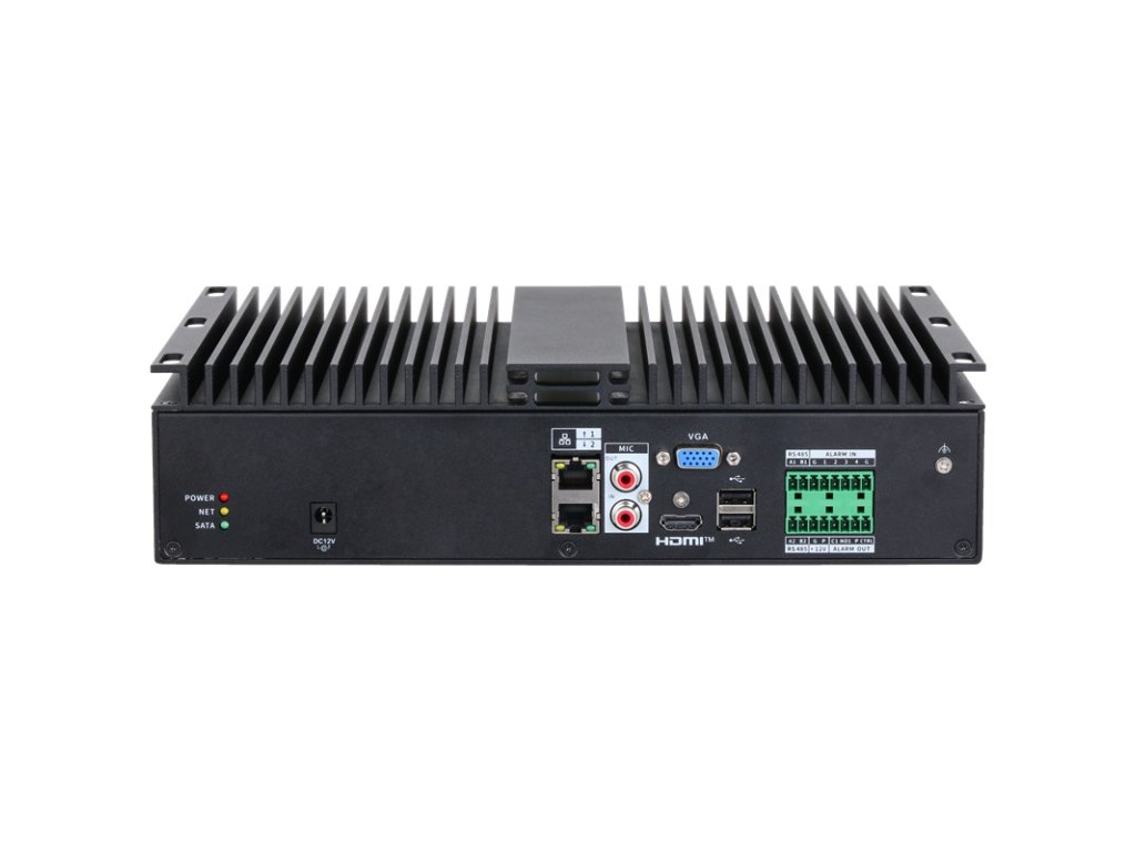 IP rekordér 4 kanálov, Smart H.265+ / H.265 / Smart H.264+ / H.264 / MJPEG; Dátový tok 256 Mbps (180 Mbps s AI), rozlíšenie kamery max. 16 Mpx; AI funkcie na NVR: Perimeter Protection max. 4 kanály, Face Detection max. 2 kanály, Face Recognition 2 kanály (FD+FR na NVR), 4 kanálý (FD na kamere), SMD Plus 4 kanálov; AI funkcie z kamier: Face detection, face recognition, perimeter protection, SMD, ANPR, people counting, stereo analysis, heat map; 1x SATA max. 20 TB na disk; Audio RCA I/O 1/1; Alarm I/O 4/2 (1x 12 VDC Out); 2x USB 2.0, 1x HDMI, 1x VGA, 2x RS-485, 2x 10/100/1000 RJ-45 port; napájanie 11-13 V DC / 4 A, spotreba max.: 5 W; pracovná teplota od -40 °C do +70 °C, hmotnosť 3,3 kg, rozmery 300,0 x 221,6 x 75,5 mm.