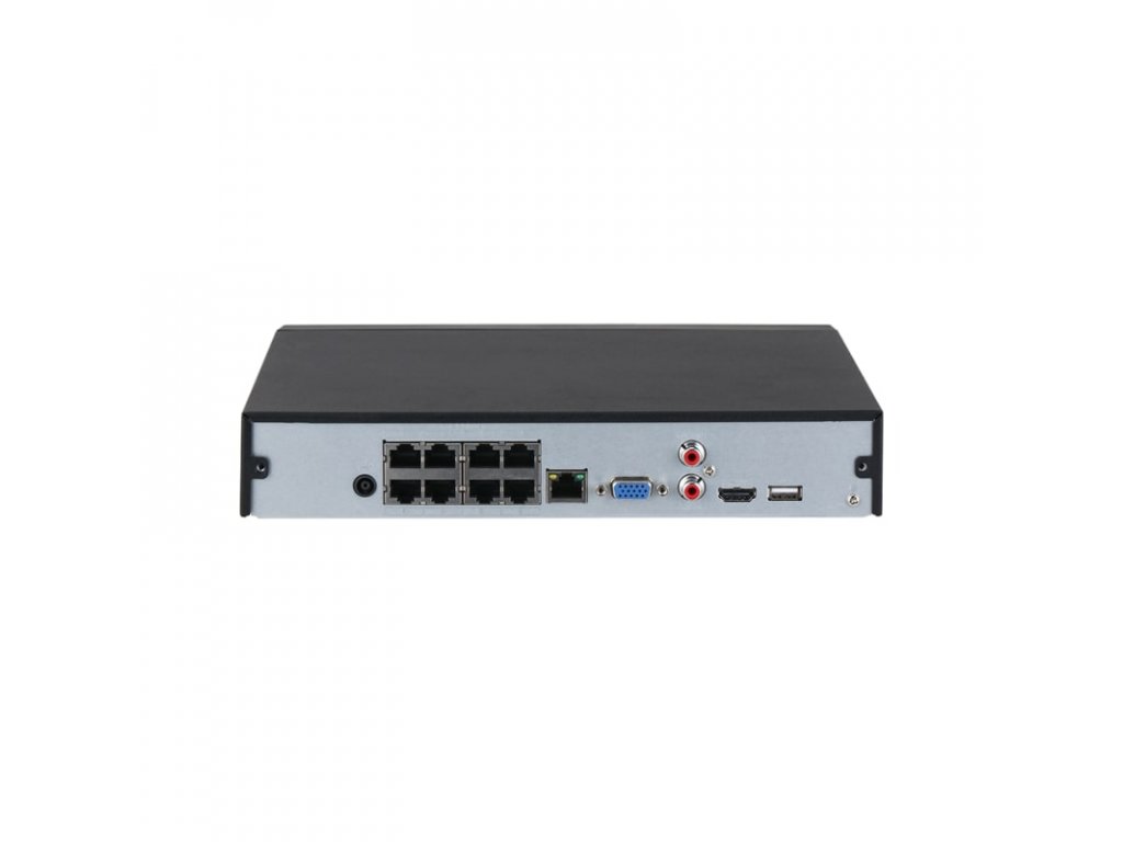 IP rekordér 8 kanálový, Smart H.265+ / H.265 / Smart H.264+ / H.264, MJPEG, AI disable: 256 Mbps incoming, 256 Mbps recording, 256 Mbps outgoing, AI enabled: 180 Mbps incoming, 180 Mbps recording, 180 Mbps outgoing, rozlíšenie kamery max. 16 Mpx, AI funkcie na NVR: Perimeter Protection 2 kanály, Face Detection 1 kanál, Face Recognition 8 kanálov (FD na kamere), 1 kanál (FD + FR na NVR) SMD Plus 4 kanály, AI funkcie z kamier: Perimeter protection 8 kanálov, SMD Plus 8 kanálov, Face Detections 8 kanálov, Face Recognition 8 kanálov, 1x SATA max. 16 TB na 1 disk, 1x RJ-45 10/100/1000, 8x RJ-45 10/100 IEEE 802.3 af/at, POE max. 72 W, jeden port max. 25,5 W; Audio RCA I/O 1/1, 2x USB 2.0, 1x HDMI, 1x VGA, napájanie 53 V DC / 1,8 A, spotreba max. 82 W, pracovná teplota od -10 °C do +55 °C, hmotnosť 0,92 kg, rozmery 260,0 x 232,7 x 47,6 mm