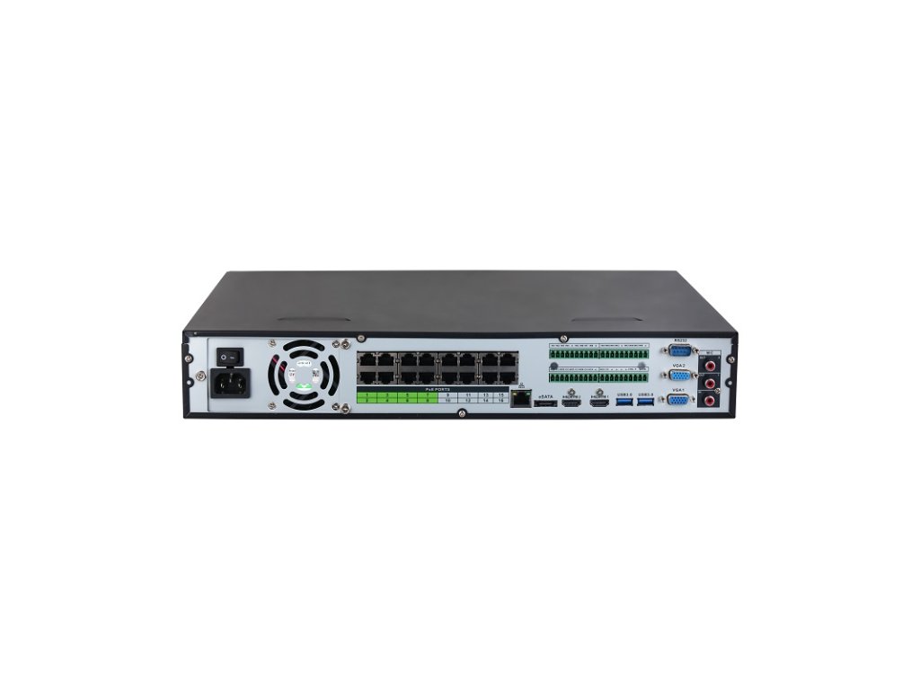 Videorekordér IP sieťový 16kanálový, záznam / živý obraz / prehrávanie vo 4K, podporované formáty H.265+ / H.265 / H.264+ / H.264 / MJPEG, záznam max. do 384 Mbps, maximálne rozlíšenie 32 Mpx na kameru, alarm I/O 16/6, audio 1/2 RCA, 4x SATA III 3,5" max. 16 TB HDD, 1x eSATA, podpora ONVIF, podpora IP PTZ Dahua a ITC kamier, AI by NVR - 4 kanály pre Perimeter Protection alebo 2 kanály pre Face Detection / Recognition vďaka NVR AI, 8 kanálov pre SMD plus vďaka NVR, 1x RJ-45 port (10/100/1000 Mbps), 16x port PoE, 1–8 podpora ePoE (na jeden port max. 25,5 W, max. 130 W), 2x HDMI (4K), 2x VGA, 1x RS-485, 1x RS-232, 4x USB (2x USB 3.0), rozmery 2U, 440,0 × 415,6 x 76,0 mm, hmotnosť 4,82 kg (bez HDD)