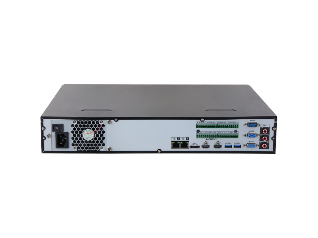 Videorekordér IP sieťový 32-kanálový, záznam / živý obraz / prehrávanie v 4K, OS Linux, podporované formáty Smart H.265+ / Smart H264+ / H.264 / H.265; záznam max. do 384 Mbps (Pri AI max 200 Mbps), maximálne rozlíšenie 32 Mpx na kameru; 4x SATA III 3.5" HDD, max. 20 TB / HDD, podpora ONVIF; video analytické funkcie na NVR: Perimeter Protection max. 24 kanálov, Face Detection max. 8 kanálov, Face Recognition max. 32 kanálov (FD kamera + FR NVR), max. 8 kanálov (FR+ FD na NVR), SMD Plus max. 32 kanálov, Video Metadata max. 8 kanálov; podpora video analytických funkcií: AcuPick, Face Detection, IVS, Face Recognition, Video Metadata, SMD Plus, Stereo Analysis, crowd disribution, people counting, heat map, ANPR, PPE detection; 2x RJ-45 port (10/100/1000 Mbps), 2x HDMI + 2x VGA, 1x RS-485 (half-duplex), 1x RS-232, 3x USB (z toho 2x USB 3.0), 1x eSATA , Audio RCA I/O 1/2, Alarm I/O 16/6 (1x 12 V / 1 A output); rozmery 440 × 412,7 × 76 mm, hmotnosť 4,52 kg (bez HDD), 100–240 VAC, 50/60 Hz, pracovná teplota od -10 °C do +55 °C