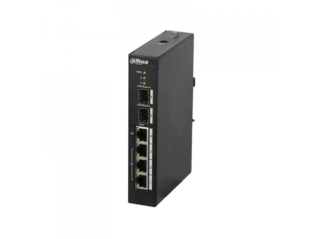 Dahua switch 3x 10/100 Mbps + 1x Gbit + 2x SFP Gbit, manažovatelný, podpora PoE pre 4 porty, 4x PoE (IEEE802.3af/at), port 1–3 max. 30 W, port 4 max. 60 W, celkovo na všetky porty max. 120 W, napájanie DC 48–57 V (zdroj je súčasťou balenia), pracovná teplota od -30 °C do +65 °C, rozmery 150 x 100 x 30 mm
