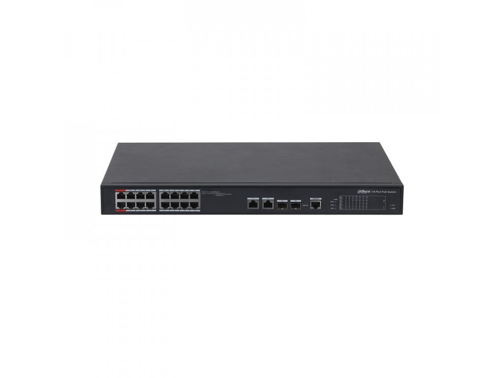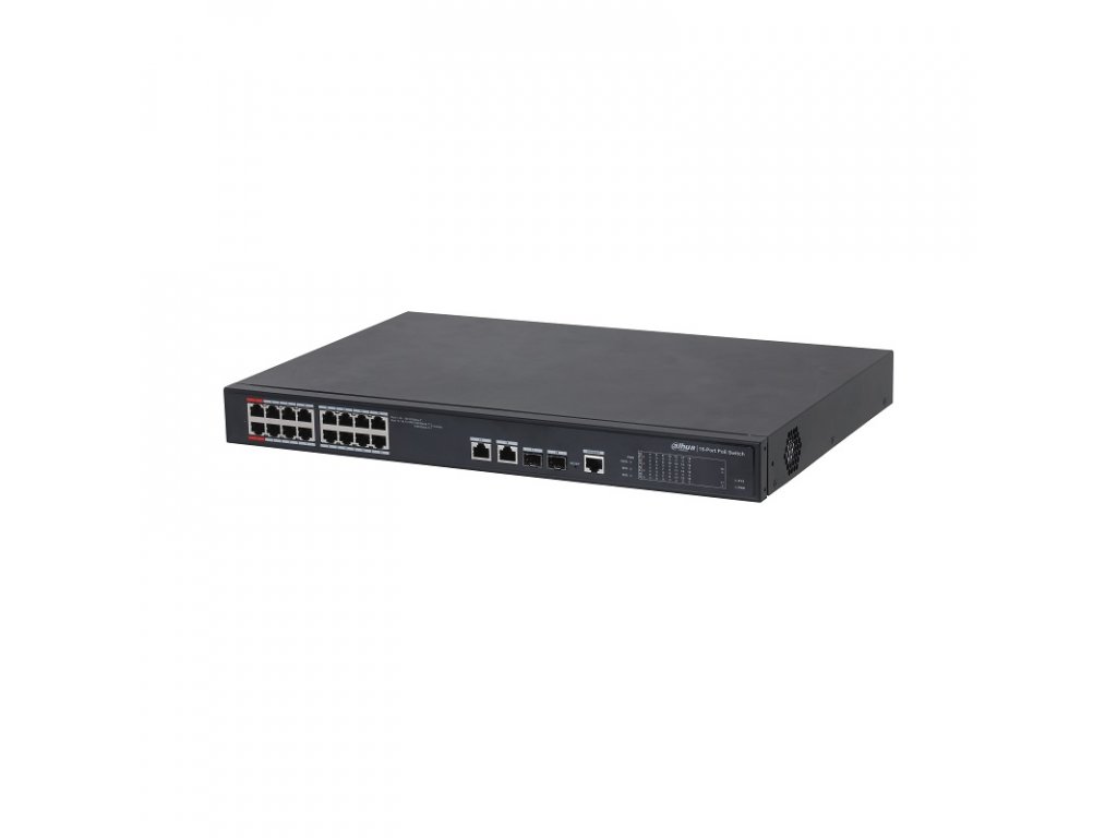Dahua 16portový PoE switch, podpora PoE++ (IEEE802.3bt) pre porty 1+2 <90 W, 16x PoE (IEEE802.3af/at), celkovo na všetky porty max. 240 W, prenosová rýchlosť: porty 1-16: 10/100 Mbps (PoE), porty 17-18: 10/100/1000 Mbps, porty 17-18: SFP 1000 Mbps, manažment, podpora STP/RSTP/MSTP, 250 m long distance PoE, PoE watchdog, ochrana pred prepätím 4 kV, napájanie 230 V AC, pracovná teplota od -10 °C do +55 °C, rozmery 440 x 300 x 44 mm, hmotnosť 0,5 kg