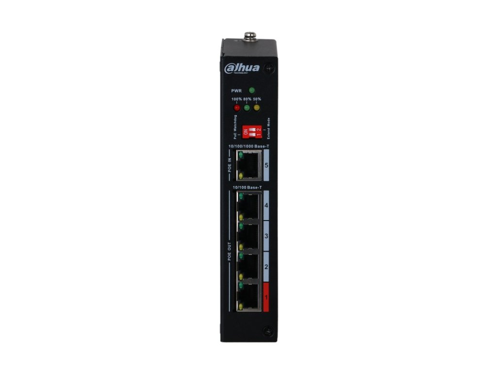 Dahua extender 4x 10/100 Mbps + 1x 10/100/1000 Mbps, port 1 podpora PoE++ 802.3bt < 90 W, porty 2–4 PoE (IEEE802.3af, IEEE802.3at) < 30 W, celkovo na všetky porty max. 90 W, PoE Watchdog, Long Distance PoE, ochrana pred prepätím 4 KV, napájanie prostredníctvom portu 5 – PoE In, pracovná teplota od -30 °C do +65 °C, rozmery 150 × 100 × 30 mm, v kombinácií s PoE switchom Dahua PFS3010-8ET-96-V2 alebo iným s generácie PoE 2.0 (90 W, PoE++) je možné dosiahnuť vzdialenosť 350 m