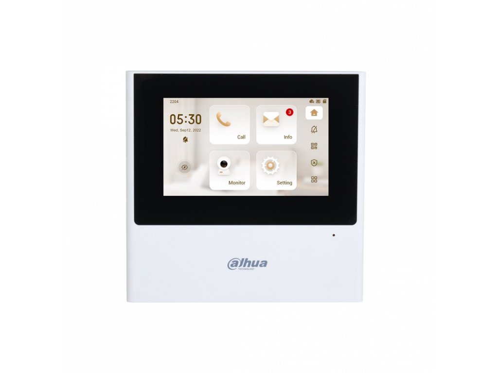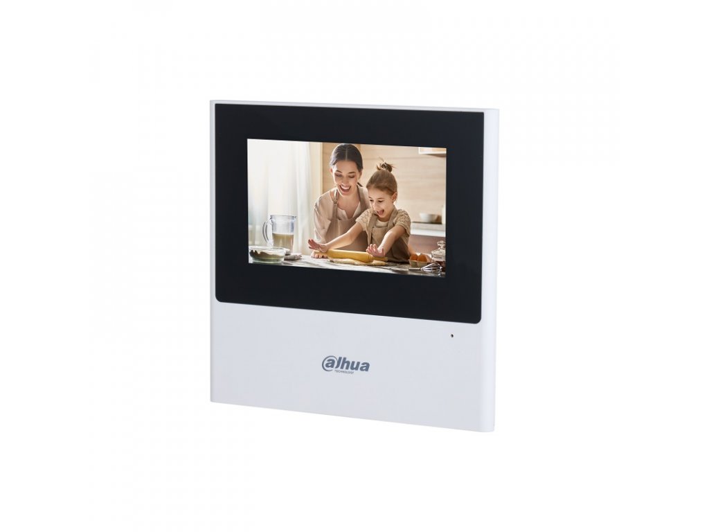 2-Wire Dahua handsfree videomonitor, prevedenie biely plast, 4.3" farebný dotykový LCD displej s rozlíšením 480 x 272 px, kompresia H.264, komunikácia TCP/IP alebo Dahua 2-Wire (nepolarizovaný 2-vodič), Wi-Fi IEEE802.11b/g/n, grafické menu, dotykové tlačidlá, interkom v rámci viacerých monitorov v byte (max. 4 monitory), pripojiteľnosť až 20 dverných jednotiek, možnosť pripojenie externých CCTV Dahua IP kamier, podpora prenosu videohovoru / Push notifikácie na Android a iOS smartfony cez internet (aplikácia DMSS), 1x RJ-45 10/100Mbps konektor pre pripojenie do siete, 4x NO kontakt pre pripojenie alarmových vstupov - funkcia EZS ústredne, 1x NO alarmový výstup, ovládanie 2 zámkov (pri kombinácií s podporovanou dvernou jednotkou a modulom druhého zámku DEE1010B), prizvonenie od dverí, napájanie externým zdrojom 48 V DC / 1000 mA (zdroj nie je súčasťou balenia), alebo switchom Dahua VTNS2003B-2, montáž na povrch, rozmery 136,0 x 140,0 x 25,5 mm, interiérové použitie