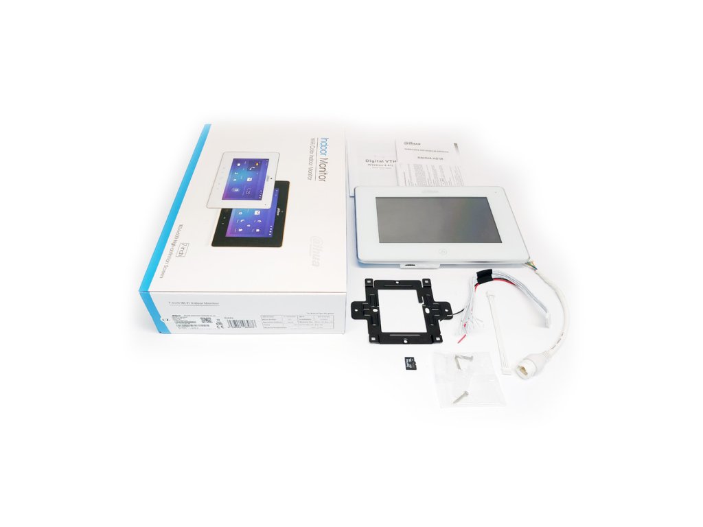 IP Dahua handsfree videomonitor, prevedenie biely plast, 7" farebný dotykový LCD displej s rozlíšením 1024 x 600 px, kompresia H.264, komunikácia TCP/IP, Wi-fi IEEE802.11b/g/n, grafické menu, dotykové tlačidlá, možnosť automatického vytvorenia obrázkov pri neprijatom hovore alebo videa pri zanechaní odkazu po vložení micro SD karty (karta nie je súčasťou balenia), interkom v rámci viacerých monitorov v byte (max. 6 monitorov), pripojiteľnosť až 20 dverných jednotiek, možnosť pripojenie externých CCTV Dahua IP kamier, podpora prenosu videohovoru / Push notifikácie na Android a iOS smartfony cez internet (aplikácie DMSS), 1x RJ-45 konektor pre pripojenie do siete, 6x NO kontakt pre pripojenie alarmových vstupov - funkcia EZS ústredne, 1x NO alarmový výstup, ovládanie 2 zámkov (pri kombinácií s podporovanou dvernou jednotkou a modulom druhého zámku DEE1010B), prizvonenie od dverí, napájanie externým zdrojom 12 V DC / 2000 mA (zdroj nie je súčasťou balenia), alebo PoE switchom (802.3af), montáž na povrch, rozmery 215 x 140 x 21 mm, interiérové použitie