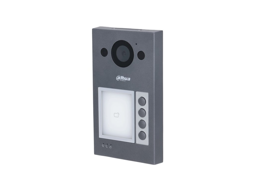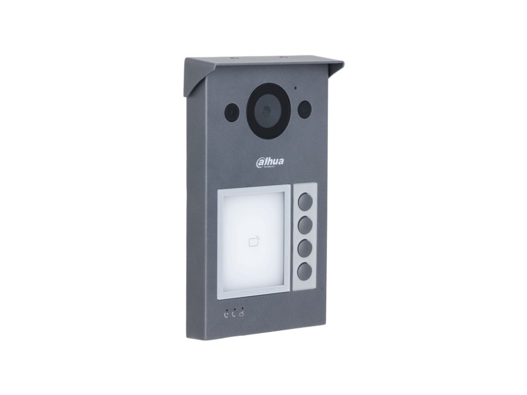 IP Dahua dverná kamerová jednotka so štyrmi tlačidlami, balenie obsahuje 4, 2 a 1 tlačidlový modul, ktorý je možné použiť podľa potreby, súčasťou je integrovaná čítačka 13,56 MHz, podsvietená menovka, antivandal nerez prevedenie, 2 Mpx farebná kamera, 139° uhol pohľadu, H.264 / H.265 kompresia, TCP/IP komunikácia alebo Dahua 2-wire, nastavovanie cez webové rozhranie, IR prisvetlenie snímaného priestoru, funkcia zanechania odkazu užívateľovi (funkcia dostupná iba s monitormi VTHxxxx), IP 65, IK 08, 1x kontakt NO/NC pre ovládanie zámku (diaľkovo aplikáciou DMSS), 1x NO kontakt odchodového tlačidla, 1x RS-485 pre pripojenie modulu ovládania 2. dverného zámku DEE1010B, napájanie 48 V DC / 1000 mA (zdroj nie je súčasťou balenia), PoE (802.3af) alebo dvojvodičovým switchom VTNS2003B-2, montáž na omietku, rozmery 188 x 107 x 30 mm